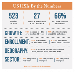 Naturally, as enrollment has grown, so have the number of colleges and universities qualifying as HSIs. According to the most recent government figures, there were 523 HSIs in 2017, with 328 schools qualifying as emerging HSIs — or those with 15 to 24.9 percent Hispanic and Latinx enrollment.