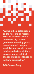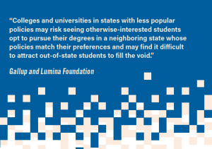 The Art & Science Group, publishers of “Politics, Policies, and Student Perspective – The Impact of State Social Policies on College Choice,” noted that in their national winter survey, aptly named studentPOLL, they found “a substantial fraction of high school seniors bound for four-year colleges as full-time students reported passing over a school they had initially considered, based exclusively on state-level political considerations. This was true across the spectrum of political ideologies.”