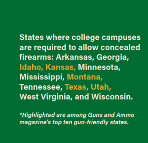 Despite this, 12 states have enacted legislation that effectively forces colleges and universities to allow concealed firearms on campus. Of that dozen, five are among the top 10 on the 2023 Guns and Ammo magazine ranked list of most gun-friendly states. Of those, both Utah and Montana faced decreasing enrollment numbers in 2023.