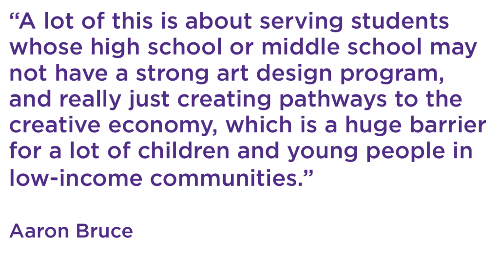 “A lot of this is about serving students whose high school or middle school may not have a strong art design program, and really just creating pathways to the creative economy, which is a huge barrier for a lot of children and young people in low-income communities,” Bruce explains.