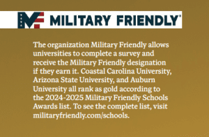 The university also offers recognition to service members, including military appreciation games in collaboration with the athletic department, and a veteran graduation reception complete with regalia specific to one’s military branch. Green Zone Training is also available to faculty and staff at CCU.