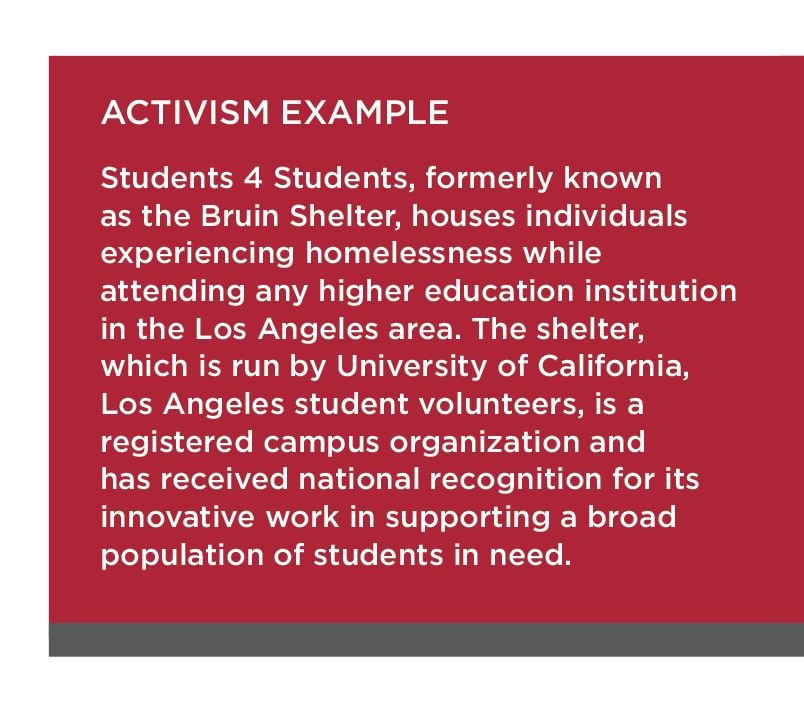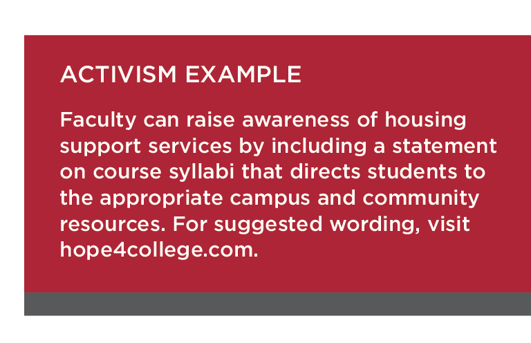 On its website, Campus Compact has gathered research and best practices for addressing student homelessness and has developed tools for faculty, administrators, student services professionals, and student leaders. Included among its online resources is the Student Housing Insecurity Mapping Tool, a simple inventory for institutions to track which resources, programs, services, and partnerships they offer for students who are at risk of or who are currently experiencing homelessness. After completing the inventory, administrators can distribute this list to faculty and staff so they are aware of what aid their institution offers and can give referrals.
