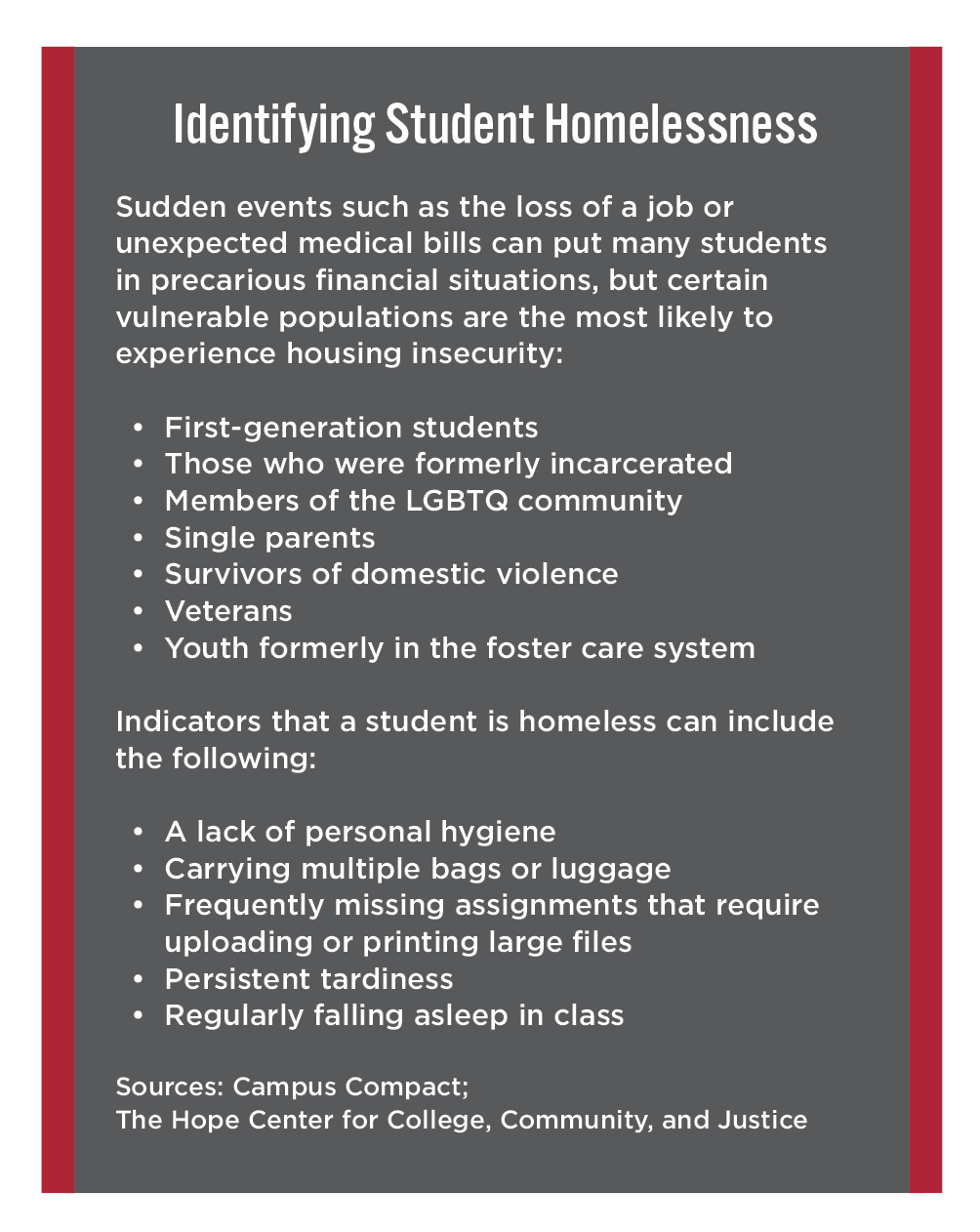 Students who are couch surfing, living out of a vehicle, or failing to pay their rent may not know where to turn for help or may fear the stigma associated with homelessness. However, increasing attention to the issue is inspiring campuses and organizations to assess what barriers their students are facing when it comes to housing and to provide stronger, more innovative support services.