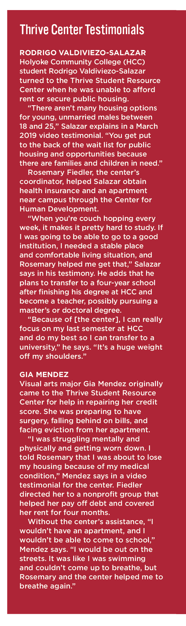 When Rosemary Fiedler came on staff at Holyoke Community College (HCC) in Massachusetts as coordinator of the recently formed Thrive Student Resource Center, it was a dream come true. Her experience on campus as a 45-year-old mother of four earning her associate degree helped lift her and her children out of poverty, and she wanted to help others facing the same hardships.