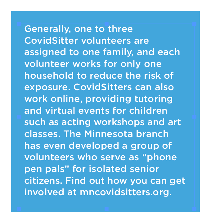 Recognizing this need, a small group of UMN medical students shared a social media post on March 13 offering free babysitting services for frontline workers. By mid-May, the group had 386 student volunteers serving nearly 300 families across the Twin Cities and had helped launch 30 sister branches of CovidSitters across 21 states, according to Brianna Engelson, a UMN Medical School student and a board member of MN CovidSitters.