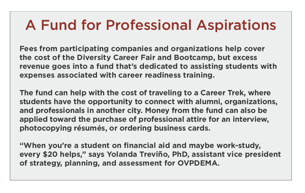 The idea for a diversity job fair came about when career development staff noticed underrepresented students would feel more comfortable and confident at an event where employers are specifically seeking diverse identities and experiences, says Yolanda Treviño, PhD, assistant vice president of strategy, planning, and assessment for OVPDEMA.
