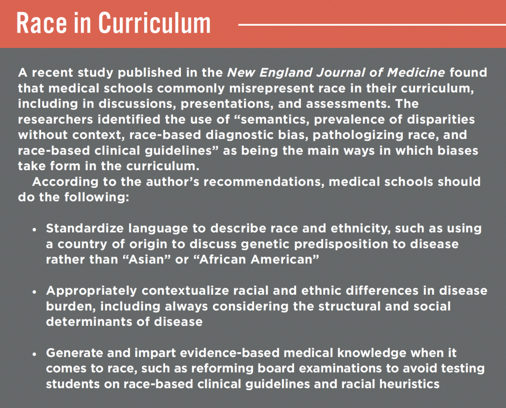 Since 2000, the Liaison Committee on Medical Education — the accrediting arm of the American Medical Association and the Association of American Medical Colleges (AAMC) — has required that medical school curricula include “the recognition and development of solutions for health care disparities.” By 2018, however, there was still a lack of clear standards for what education on racial disparities should look like, according to the AAMC 2017-2018 Curriculum Inventory (CI). Using self-reported data from medical school educators and deans on their institutions’ curriculum content, researchers found that only 40 percent of schools were teaching about racial disparities at the time. Another CI report shows that for the 2020-2021 academic year, 70 percent of medical schools had anti-racist curriculum. However, on average, anti-racist content made up less than 1 percent of the curricula.
