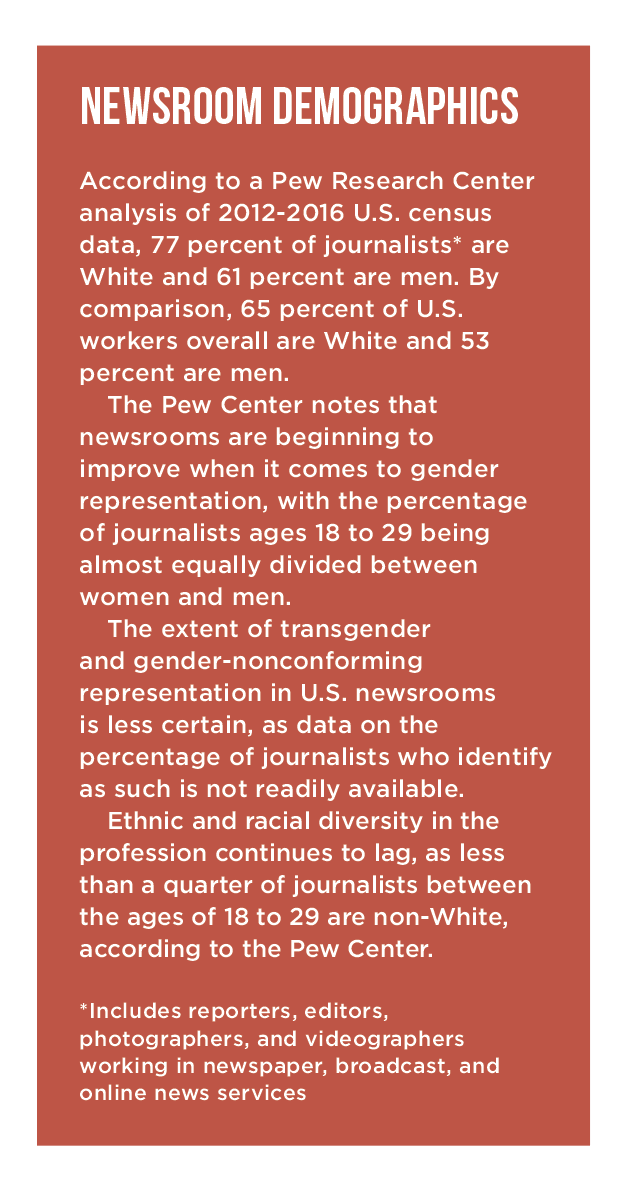 Diversity and cultural competency have long been a struggle in the journalism industry. In fact, diversity in the profession is so lacking that newsroom employees are more likely than all other U.S. workers to be White and male, according to a 2016 study by the Pew Research Center.