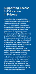 Prison education programs (PEPs) have long been proven to be an incredible benefit to the individuals enrolled and to society at large. These efforts provide opportunities for self-growth, reflection, and personal development that are often inaccessible to a population that is largely composed of marginalized people.