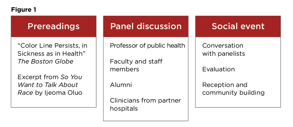 The DEI Council decided to introduce an orientation activity that would provide common language around the dynamics of racism and its impact on the provision of healthcare. The president tasked a small subcommittee of the council to design an activity for the September 2018 entering cohorts. The subcommittee proposed a half-day event titled “What is the Institute’s Role in Health Care? Exploring the Impact of Power, Privilege, and Positionality.” Through pre-readings, reflection, and panel discussion, students would confront the structural causes of healthcare disparities and begin to examine their own role in combating them (Figure 1).