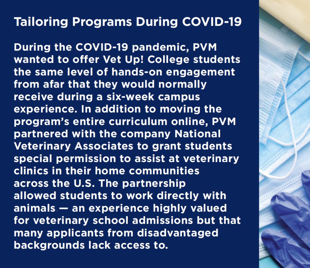 In 2018, PVM received a $3.18 million grant from the Health Resources and Services Administration of the U.S. Department of Health and Human Services to launch Vet Up! The National Health Careers Opportunity Program Academy for Veterinary Medicine. The three-part program is also a 2021 recipient of INSIGHT’s Inspiring Programs in STEM Award. It offers extensive outreach, recruitment, and support for prospective and current veterinary students who are underrepresented in the profession.