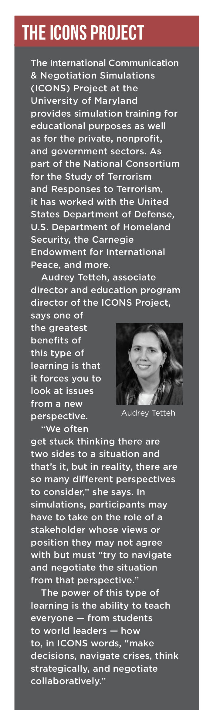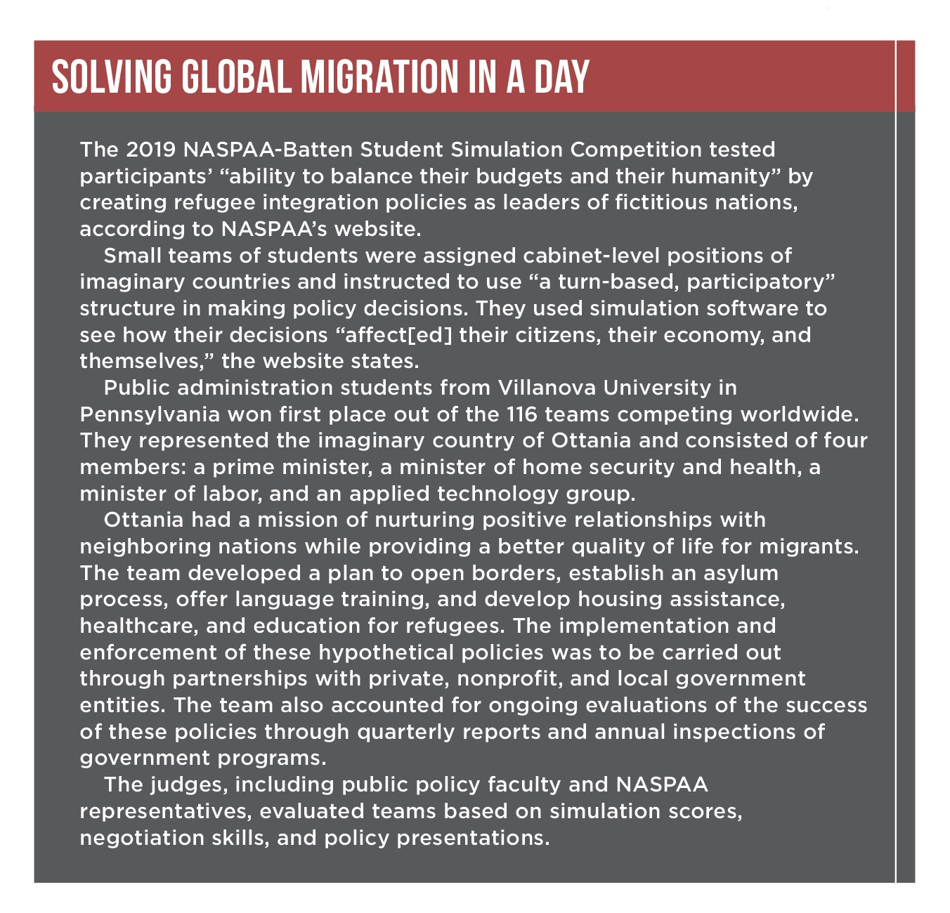 NASPAA recently created the Simulation Network, which allows its member schools to showcase their own simulations in the form of presentations, webinars, demos, and panels. Golas says the association hopes to eventually host regional simulation competitions that focus on more local, rather than global, issues.