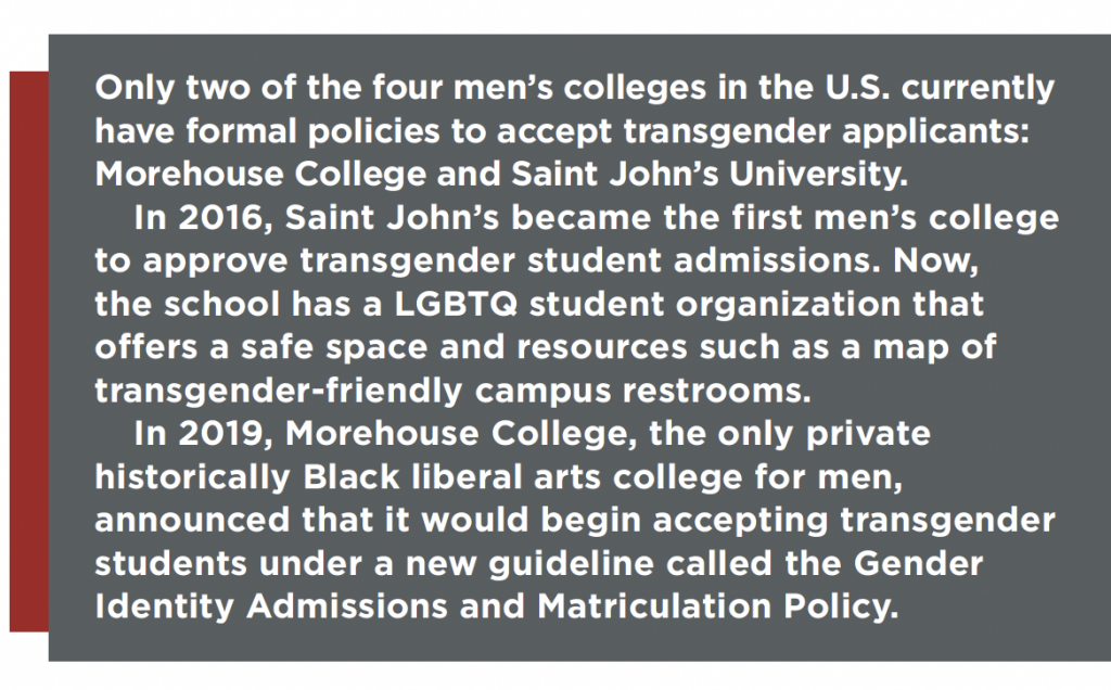 Now, many traditional single-sex schools openly admit these students, but few appear to offer unique programs or initiatives to recruit, retain, or support them.