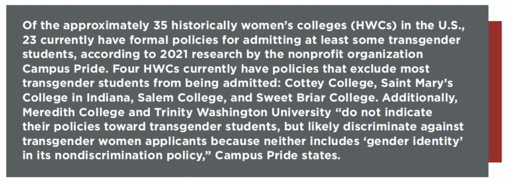 Some HWCs have recently taken unique steps to become more welcoming. At Barnard College, the Office of Diversity, Equity, and Inclusion launched a webpage in 2021 titled “Trans@Barnard” that provides resources such as housing accommodation requests and updated name forms. The college’s Center for Engaged Pedagogy developed a guide and offers workshops for faculty on gender inclusion in the classroom. In response to feedback solicited from the campus community, Barnard also hired a LGBTQ+ Outreach Coordinator to support students, according to Jennifer Rosales, PhD, vice president for inclusion and engaged learning and chief diversity officer.