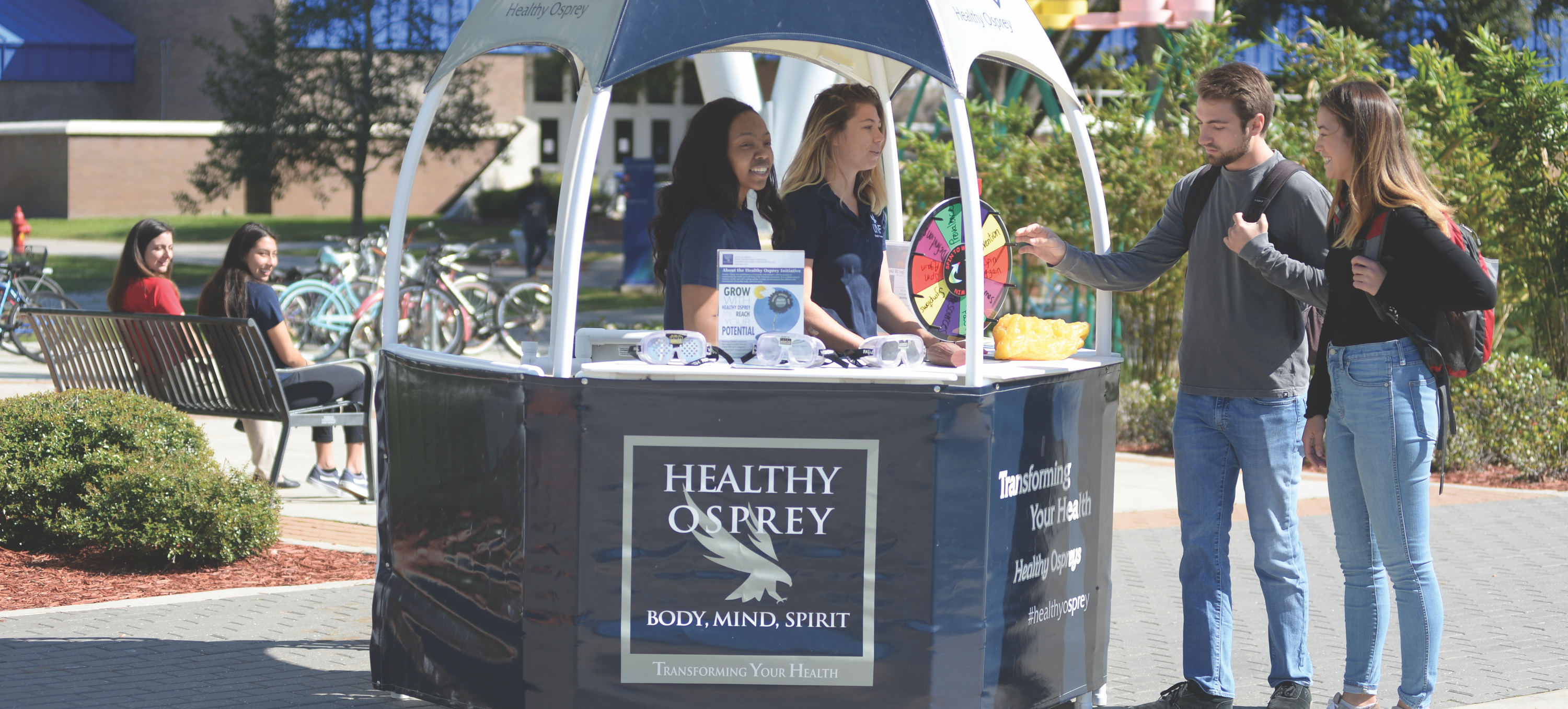 three people pose in front of a UNF banner