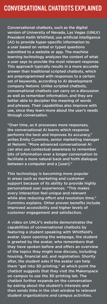 Creating a digital avatar of a president is one of the more innovative ways that colleges and universities have begun using artificial intelligence (AI), but UNLV is not alone in its endeavor to use this technology to support students and build community. Georgia State University (GSU) and Elon University have previously implemented some form of AI to promote student success. This approach, if balanced with effective in-person communication, can be especially beneficial for first-generation and economically disadvantaged students who are less likely to know how to navigate the college experience, Whitfield explains.