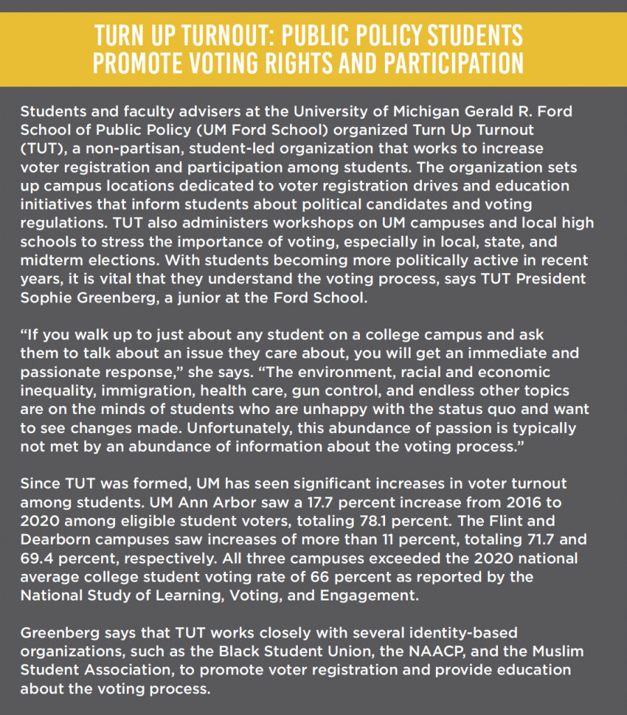 Education and community engagement are perhaps the most crucial keys to addressing the issues of systemic racism and social injustice within the world of public policy. Recognizing this, the University of Michigan Gerald R. Ford School of Public Policy (Ford School) has created numerous programs and initiatives with the goals of teaching its students about the realities of racial injustice, communicating effectively across cultural and ideological differences, and using their voices to affect societal change. Most notably, the school launched the Center for Racial Justice in September 2021, which aims to address inequities through events focusing on activism and racism in public policy and by hosting a fellowship program.